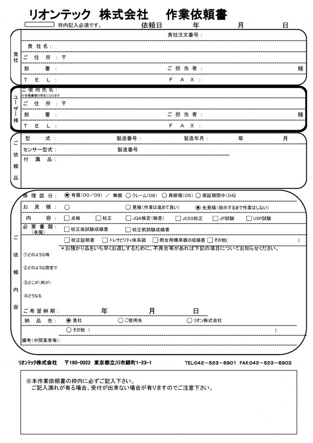 取扱製品 作業依頼書 騒音・振動測定器 地震計 微粒子測定器 医用測定器 表示装置 風速計 学校環境衛生測定器 室内外環境測定器 放射線計・デジタル粉じん計 関連製品 環境衛生関連資料・大会等予定 会社概要 お問い合わせ 作業依頼書 作業依頼書 作業依頼書はこちらからダウンロードしてご利用ください。
